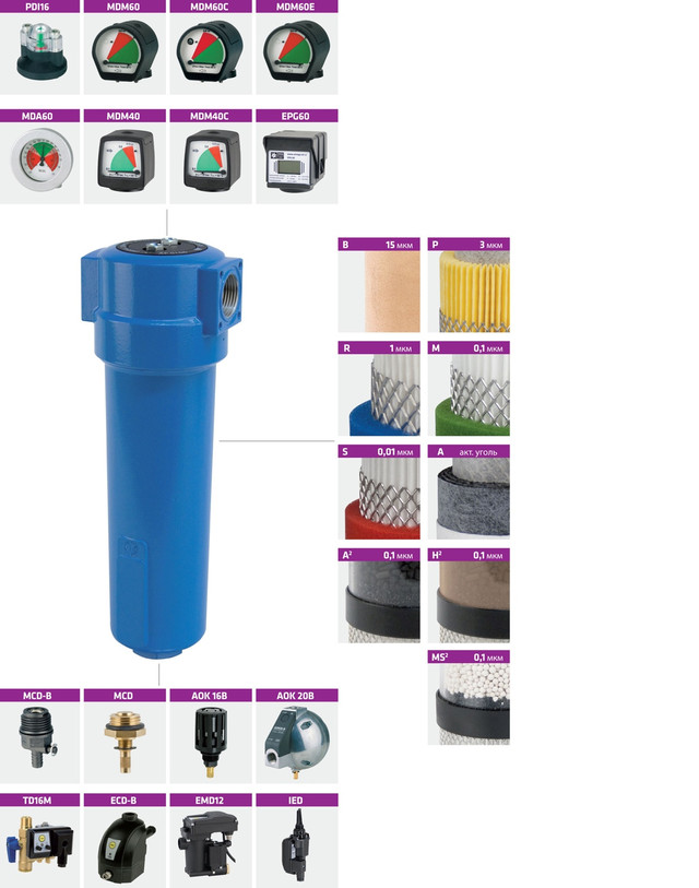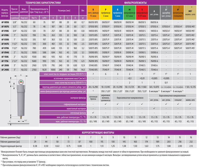 Типорозмір фільтрів залежить від витрати стисненого повітря, а також типу і ступеня забруднення. У серії AF застосовуються елементи: B, P, R, M, S, A, A2, H2
